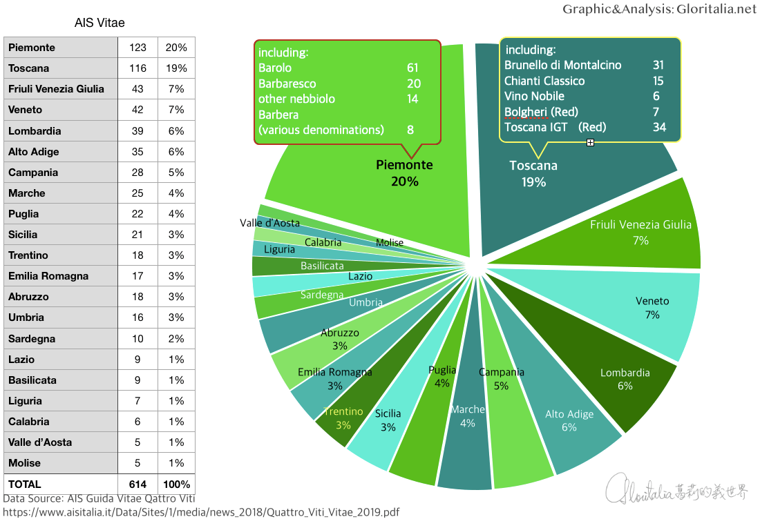從大區獲獎的酒款數量來看,明顯地看出 AIS 給予皮埃蒙特及托斯卡納大區四藤獎酒款較大紅蝦三杯獎酒款多出許多,但若從比例分佈來看,托斯卡納大區獲獎酒款在兩份名單中都約佔 19%,AIS 似乎較偏好皮埃蒙特大區 (20% vs. 大紅蝦 16%),而大紅蝦則給西西里 (6% vs. AIS 3%) 及威尼托 (9% vs. AIS 7%) 更多些關注。