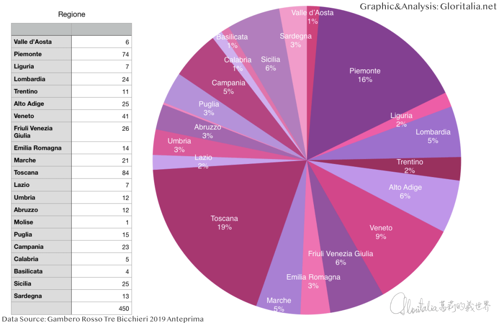 One notable fact is that red wines are highly awarded, yet proportionally speaking AIS seems to award more reds (65.5%) while Gambero Rosso whites (31.6%). Worth noticing also that 6% of Quattro Viti are desert wines which counts only 1.5% of Tre Bicchieri. When dive into each region, reds are the majority for many except Friuli Venezia Giulia & Alto Adige where whites are dominant. Trentino & Lombardia are no doubt 2 regions with great amount of excellent sparkling wine – traditional methods.