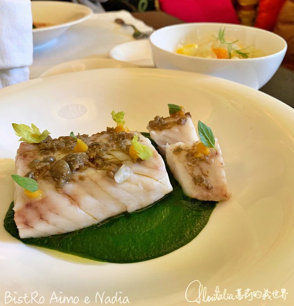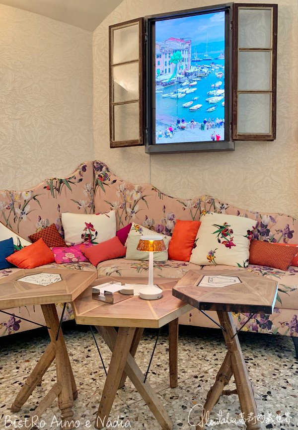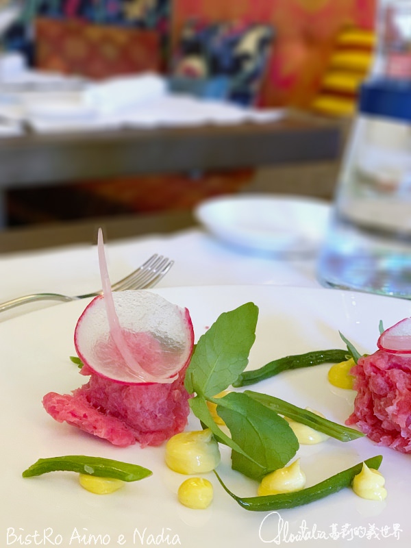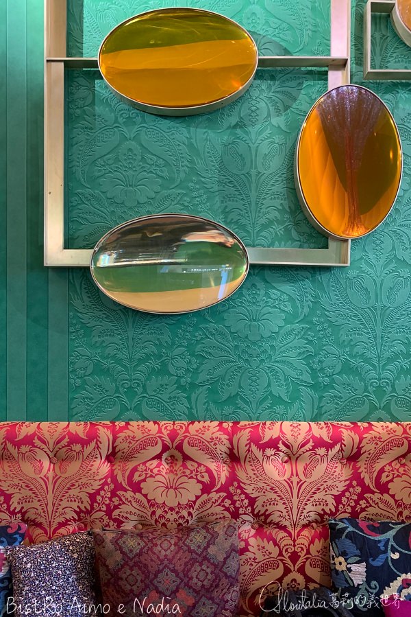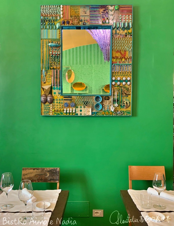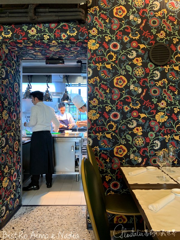 2018 年四月,Aimo e Nadia 的兩位新生代主廚與這位號稱「米蘭設計教母」的 Rossana Orlandi 跨業合作,開啟了 BistRo Aimo e Nadia。BistRo 的空間裝潢沿襲教母藝廊的風格,觸目所及的色澤鮮艷搶眼的花布,出自於擅長大膽花紋的 ETRO 品牌,營造出略帶有後巴洛克設計的影子。而從桌椅、家具到牆飾及燈飾,則是教母收藏的新銳設計師作品,包括 Emanuela Crotti 的鏡子、McCollin Bryan 的銅製樹脂牆飾、Jacopo Foggini 的吊燈,等等。新與舊、繁複與簡單在整個空間交錯,一點也沒有違和感。