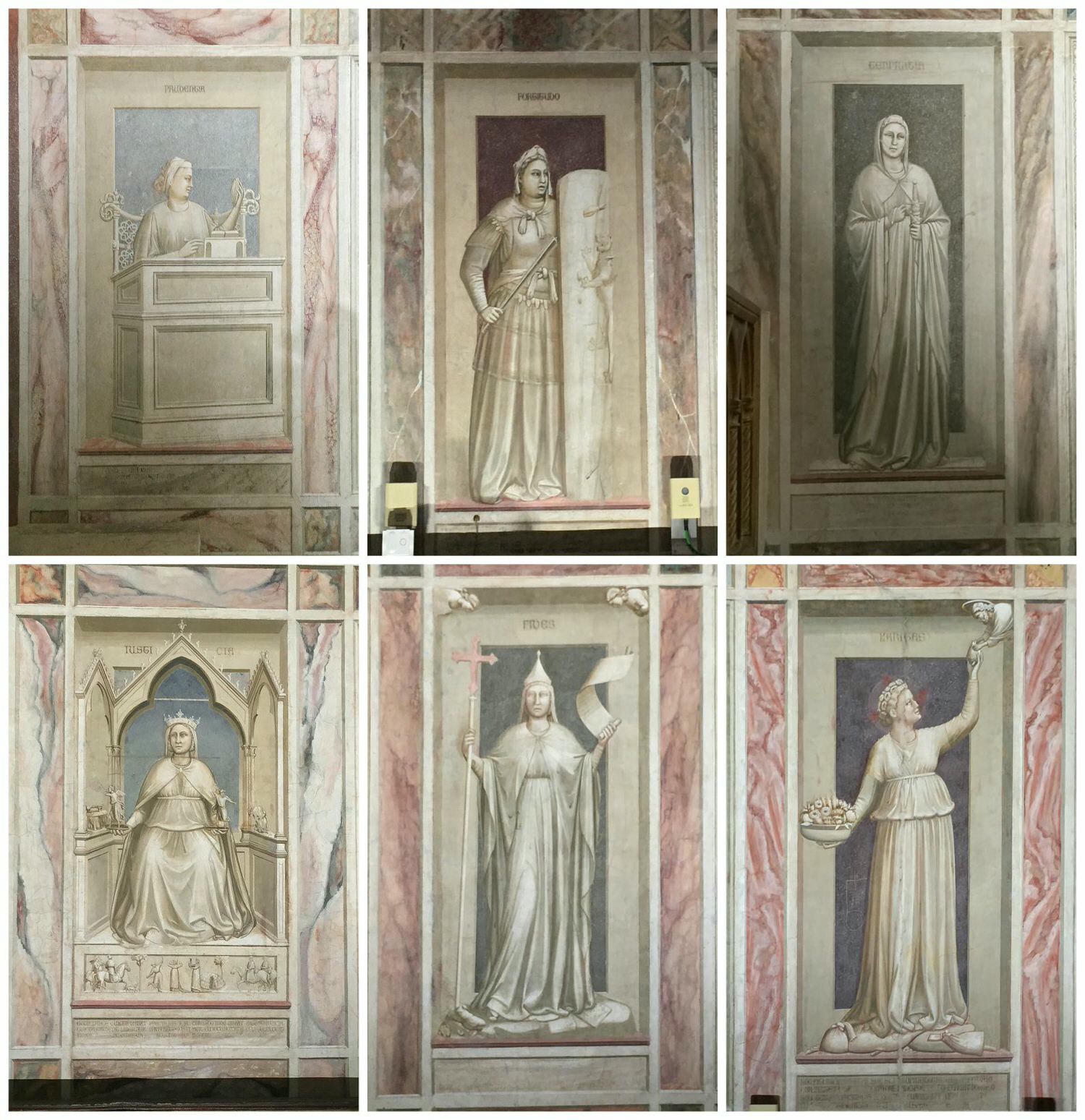 兩面牆的畫作大約可分成三層,最上層是喬托詮釋聖母瑪莉雅雙親的故事,中間一層也是與大部分人視線平行的部分則是描述耶穌基督從出生到受難、升天的故事。最底下一層,喬托則畫了七宗罪與七美德,若仔細看,七宗罪以絕望收場,而七美德則以希望結尾。