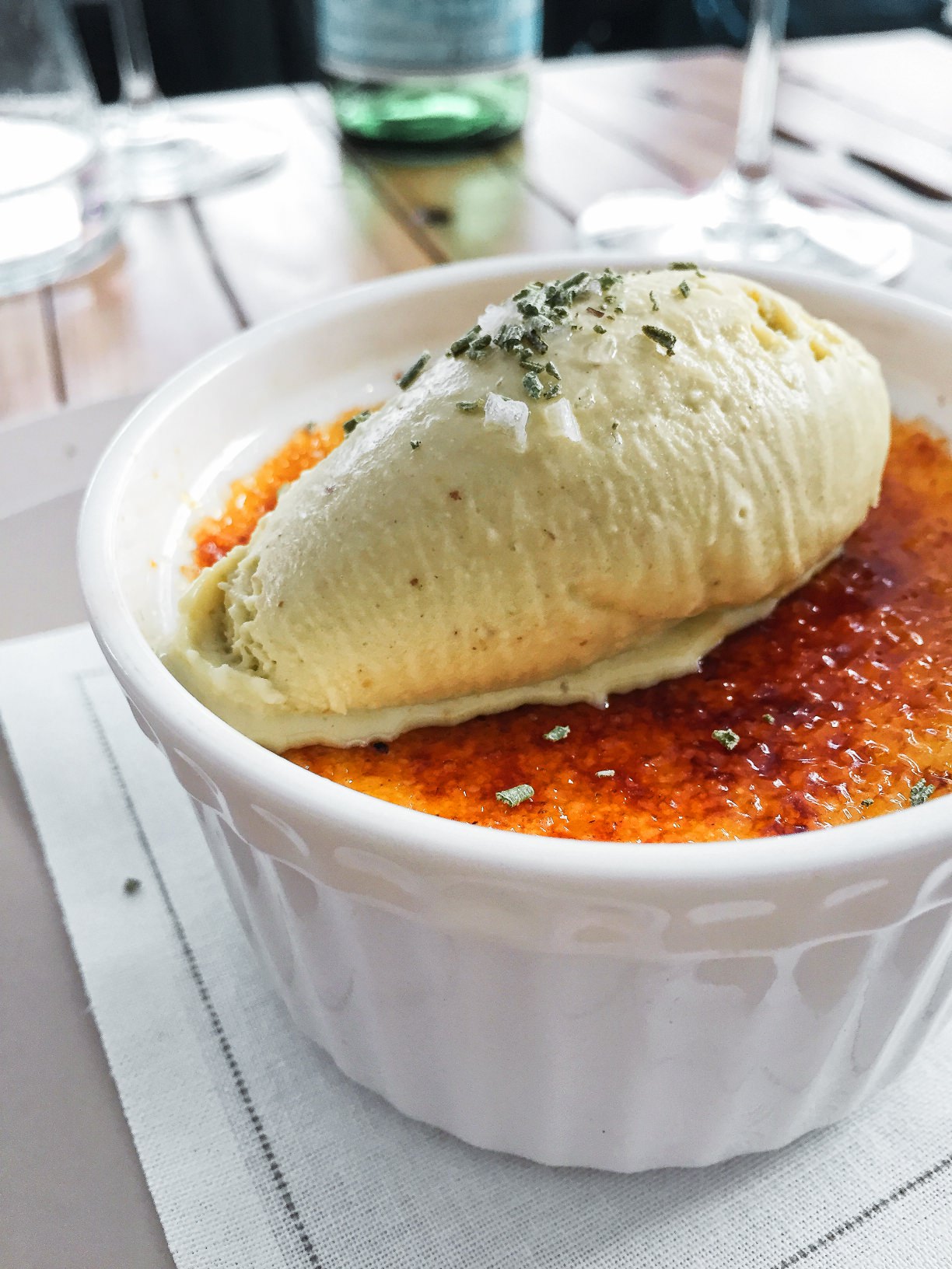 - Creme brûlé ricotta e rosmarino con gelato al pistacchio