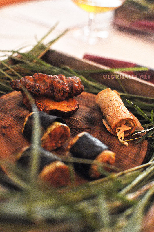 - Couliflower ravioli, »Drežnica« goat kid broth, brain, black bean and anchovy drops, grenkuljica (wild bitter herb)