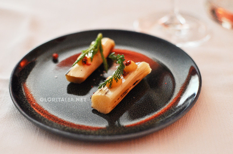 - Green asparagus, egg yolk marinated in spruce, mussel “prosciutto” 春天綠蘆筍與平凡無奇的蛋真是絕配