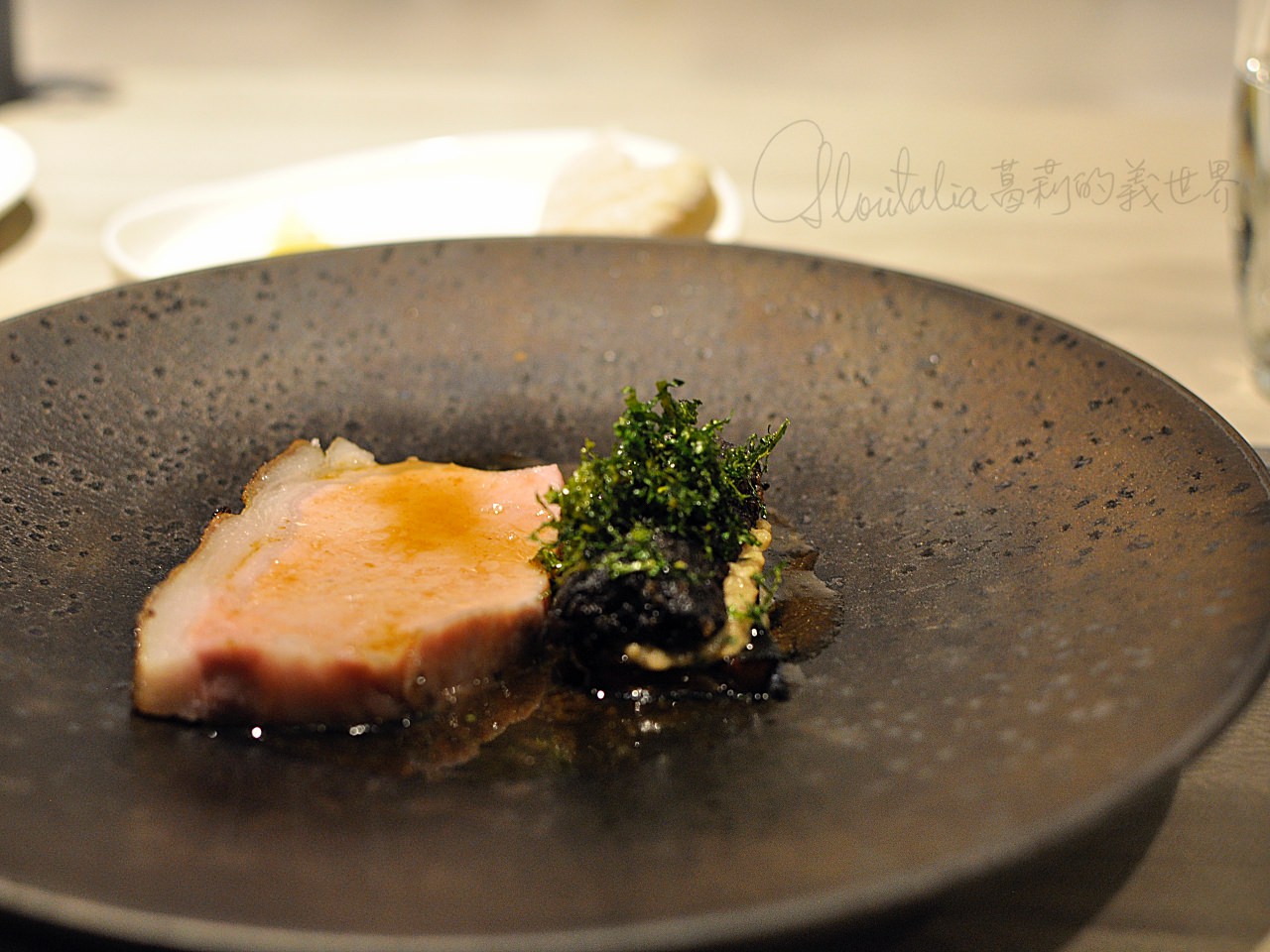 - aged pork loin, black pudding, aubergine, kale 嫩豬里肌與黑布丁