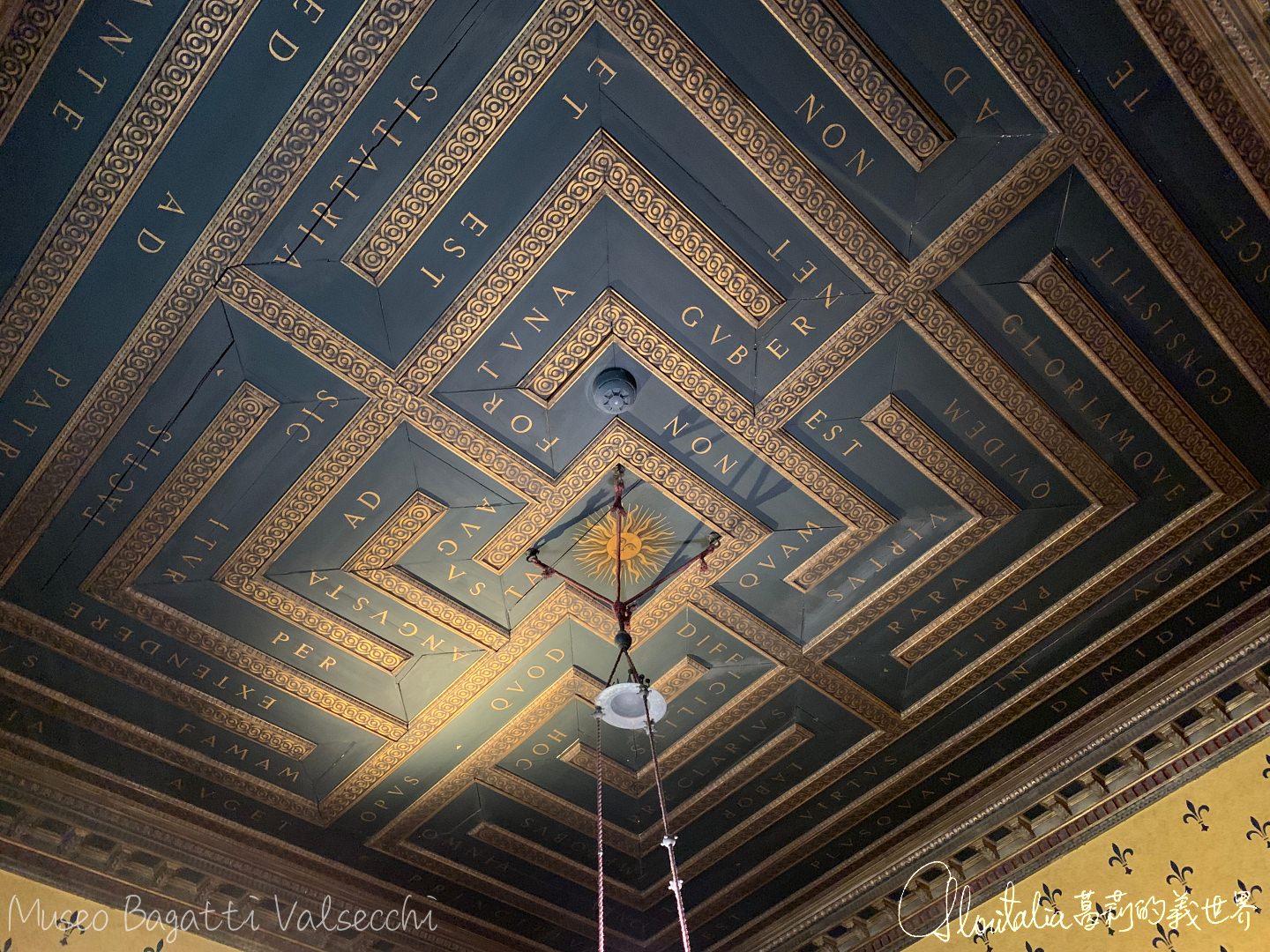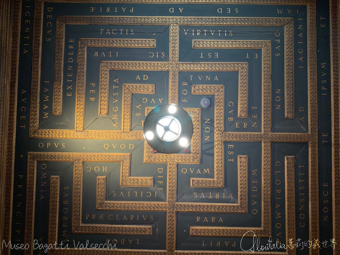 巴卡蒂.瓦爾賽吉博物館中,還藏著一個像迷宮般的天花板。這設計靈感來自於 16 世紀的曼托瓦公爵宮 (Palazzo Ducale di Mantova),裡頭的文字也是出自 Fausto 與 Giuseppe 兩兄弟的巧思。