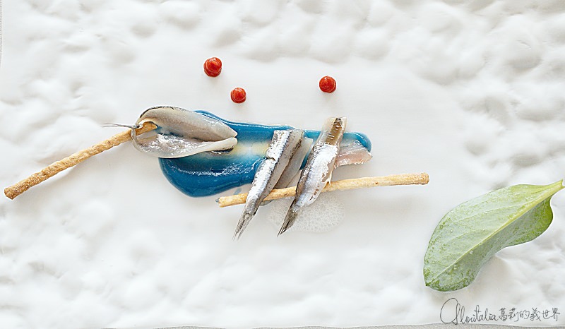 從苦味到酸甜,兩道開胃菜確實地扮演著「開胃」的角色,味蕾也已經從南歐旅行到南美,接著又出乎意料地,被帶到北歐挪威的 Lofoten 漁村島,漁民曬鱈魚的情景重現眼前,只是主廚在麵包棍上晾著醃過的新鮮鯷魚。這道「相機先食」的料理還有其他驚喜!旁邊的那片綠葉,看似平凡,但吃起來有生蠔的味道,而鯷魚底下的藍海,則是紫色甘藍泥加上鹼性的食用蘇打而成!嗯,看來要當主廚不僅要會煮,好像還要懂得化學呢!