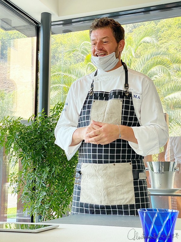 從開胃菜到甜點,布魯內主廚的料理展現出的是溫潤和諧的一致性,這也呼應著他的性格。餐後閒聊時,另一半笑著對布魯內主廚說:「我老婆是個吉祥物喔!因為每次我們去過的餐廳,不久一定會拿到米其林星星。」布魯內主廚聽到另一半老王賣瓜式的誇耀,客氣地報以靦腆的微笑。