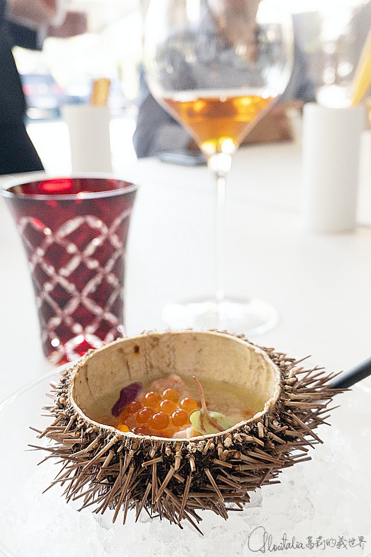 開端是 Campari 苦味酒醃漬過的薯片搭配以苦艾酒 Vermouth 調出的 Americano 調酒,確實是充滿了米蘭與都靈的氛圍,接著送上的,是偽裝成海膽的檸醃鱒魚 ceviche,滋味清爽,ceviche 是拉丁美洲常見的一道料理,用西芹代替洋蔥,添了鮮甜減去辛辣。