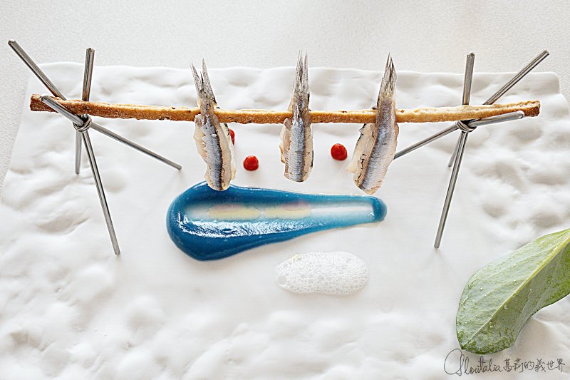 從苦味到酸甜,兩道開胃菜確實地扮演著「開胃」的角色,味蕾也已經從南歐旅行到南美,接著又出乎意料地,被帶到北歐挪威的 Lofoten 漁村島,漁民曬鱈魚的情景重現眼前,只是主廚在麵包棍上晾著醃過的新鮮鯷魚。這道「相機先食」的料理還有其他驚喜!旁邊的那片綠葉,看似平凡,但吃起來有生蠔的味道,而鯷魚底下的藍海,則是紫色甘藍泥加上鹼性的食用蘇打而成!嗯,看來要當主廚不僅要會煮,好像還要懂得化學呢!