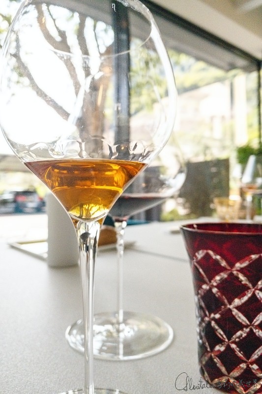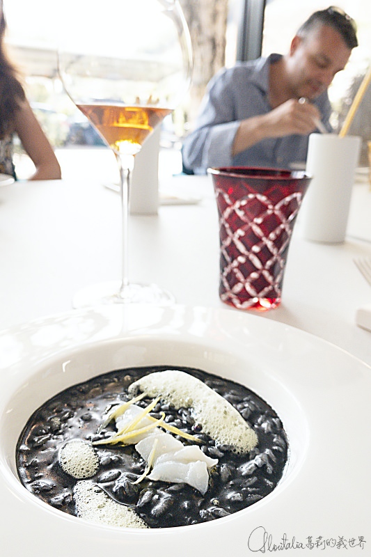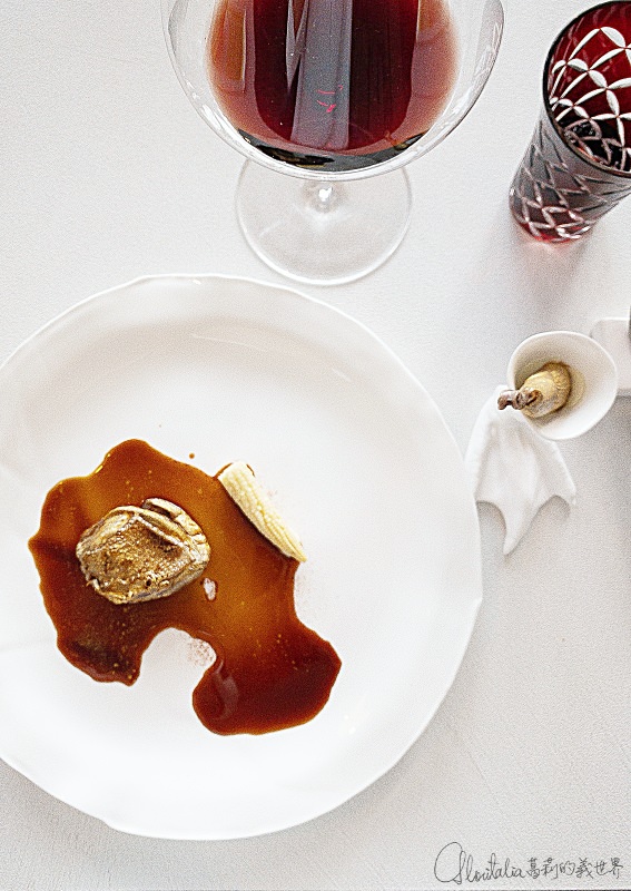 嘿,驚喜才剛開始呢!墨黑色燉飯看似經典,但黑色的部分使用了食用煤,清爽的高湯及檸檬汁更為燉飯帶來不可思議的酸爽度;非常法式的鵝肝與蝸牛,先蒸過再乾煎的鵝肝竟然有豆腐的口感!最後以撒上金粉、火侯恰到好處的鴿肉來紀念主廚在佛羅倫斯的日子。為什麼撒上金粉呢?因為佛羅倫斯正是個閃著金光的城市啊!