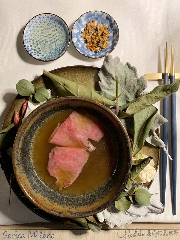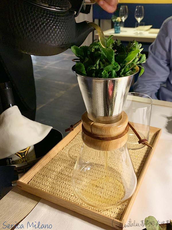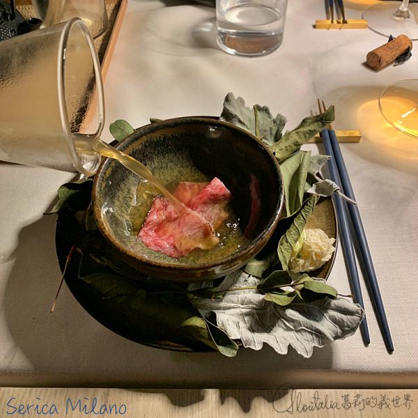 涮牛肉的和牛 (wagyu) 薄片不驚奇,令人難忘的是充滿著義大利新鮮香草植物香氣的高湯。熱騰騰的高湯裝盛在茶壺裡,由侍者在桌邊倒入有著包括薄荷、香茅、百里香等各種香草植物的漏斗後,再倒入裝著和牛的碗中… 這香氣雖讓我想起了越南牛肉河粉,但那牛肉高湯的滋味,卻紮實地混著中式與義式傳統。
